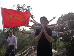 早上,陽光明媚,大家興致勃勃,沿著茂密山林間的石階,逐級攀登。一路歡歌笑語,其樂融融,不知不覺已到山頂。 | |
