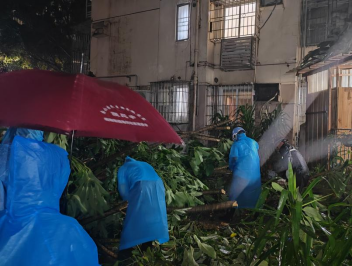 留守管理處值夜班的主任葉昌華、夏隊長,對講機里不時傳來報告:B區(qū)3棟旁一棵樹枝斷了、B區(qū)6棟前斷了一根樹枝、A區(qū)5棟一棵大樹刮倒了.......。臺風“蘇拉”逃離后,葉主任、夏隊長帶領值班的隊員,穿著雨衣、拿著工具趕赴現(xiàn)場,清理阻礙道路通行的樹枝。夜間,雖然溫度較低,風也大,但他們?nèi)员挥晁?、汗水濕透一身,干得歡而帶勁!
